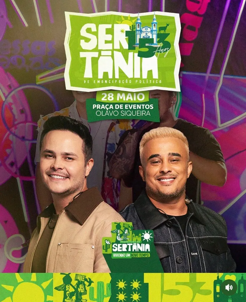 A dupla sertaneja cantará seus maiores sucessos para o povo sertaniense em um show que promete fortes emoções e praça lotada a partir das 21h, gratuitamente. O evento faz parte da iniciativa da prefeitura pelo desenvolvimento cultural e celebra o orgulho de viver um novo tempo na cidade.