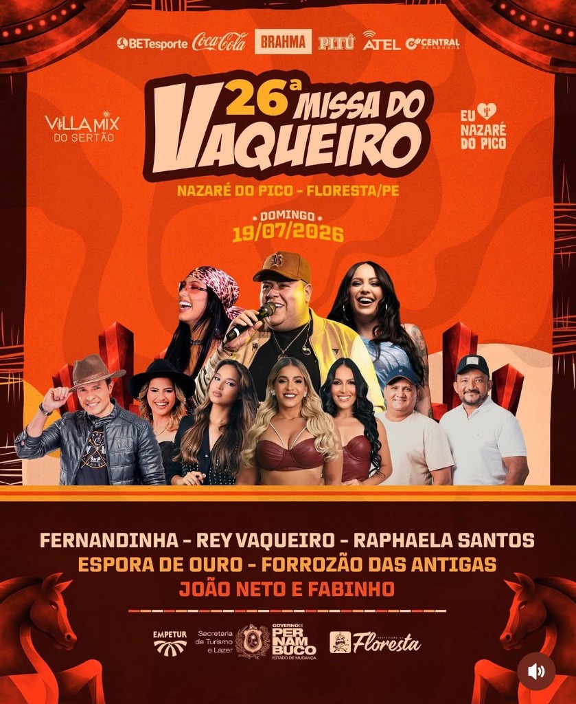 O Governo do Estado de Pernambuco, com apoio de peso da Empetur e Prefeitura, orgulhosamente entregam ao povo sertanejo o cartel oficial de comemorações da 26ª edição da Missa do Vaqueiro no distrito histórico de Nazaré do Pico, município amado de Floresta (PE).