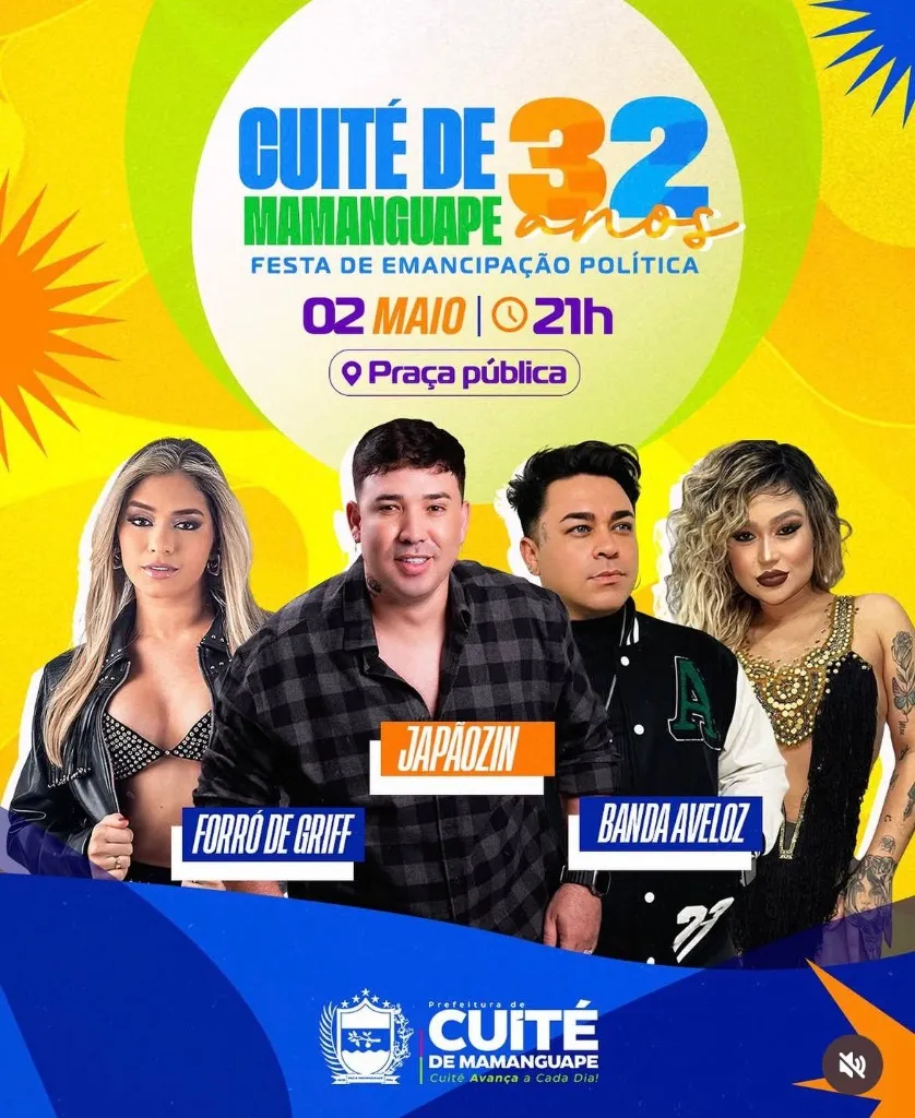 No dia 02 de Maio de 2026, a cidade de Cuité de Mamanguape (PB) irá comemorar a sua Festa de Emancipação Política de 32 anos com muita música na Praça Pública. O evento promete reunir a população e visitantes para uma noite inesquecível de celebração.