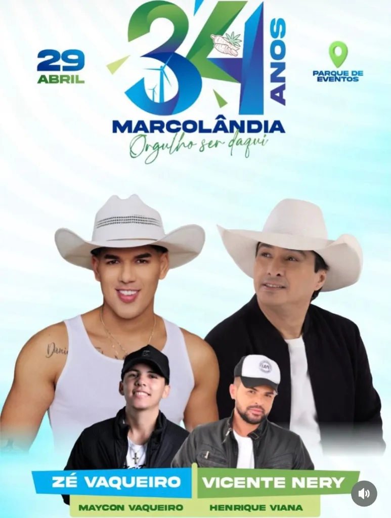 Sob o lema "Orgulho de Ser Daqui", a cidade movida a energia eólica no interior do estado do Piauí fará grande alarde. O aniversário de 34 Anos de Marcolândia acontece no dia 29 de Abril de 2026 num mega palco montado no Parque de Eventos.