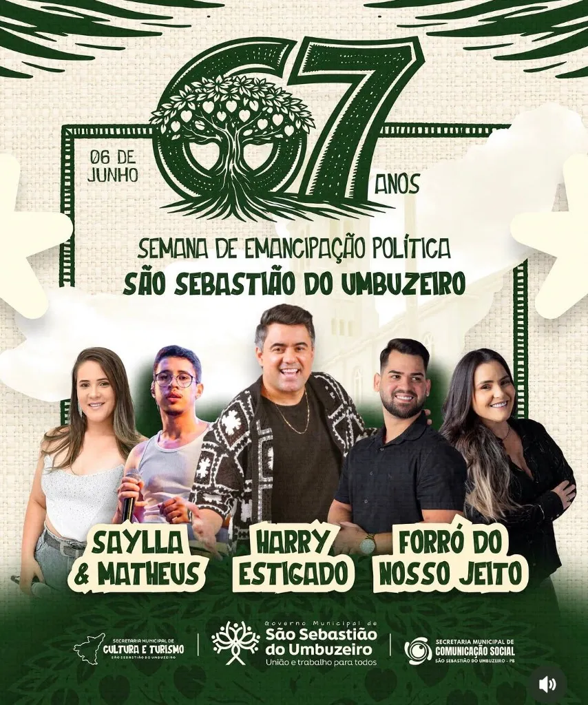 A Semana de Emancipação Política de São Sebastião do Umbuzeiro (PB) acontece no dia 06 de junho com shows gratuitos de Harry Estigado, Forró do Nosso Jeito e Saylla & Matheus.