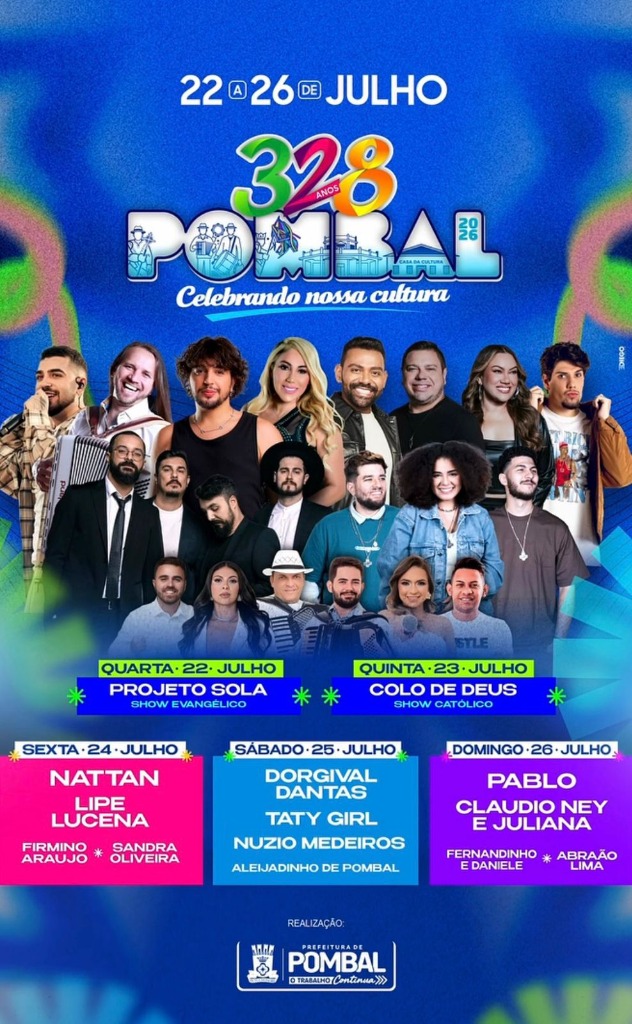 Excelente notícia para o turismo e a cultura de Pombal (PB)! A programação completa do grandioso Aniversário de Pombal 328 Anos já está entre nós. O Governo de Pombal surpreendeu positivamente a economia local e os fãs forrozeiros trazendo a consolidação máxima da Aniversário de Pombal 328 Anos, que já é considerada uma das maiores da história.