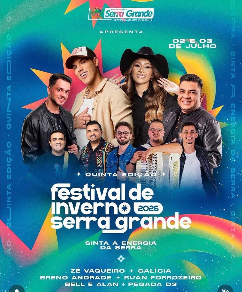 Prepare o agasalho que a "Energia da Serra" vai dominar! A Prefeitura Municipal de Serra Grande confirmou as atrações explosivas para a sua 5ª Edição do tradicional Festival de Inverno, marcado para os dias 02 e 03 de Julho de 2026. Como de costume, a cidade irá receber milhares de turistas dispostos a espantar o frio característico da época com muito forró, vaquejada e animação.