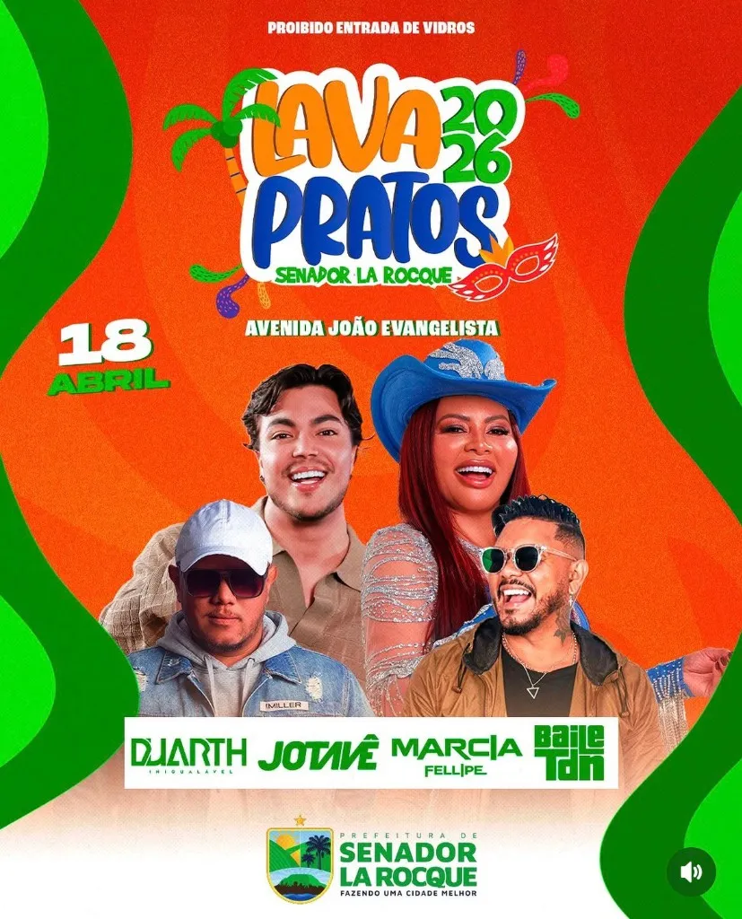 Prepare-se para o melhor pós-carnaval! A cidade de Senador La Rocque (MA) realiza o seu tradicional Lava Pratos 2026 no dia 18 de Abril de 2026 na Avenida João Evangelista.