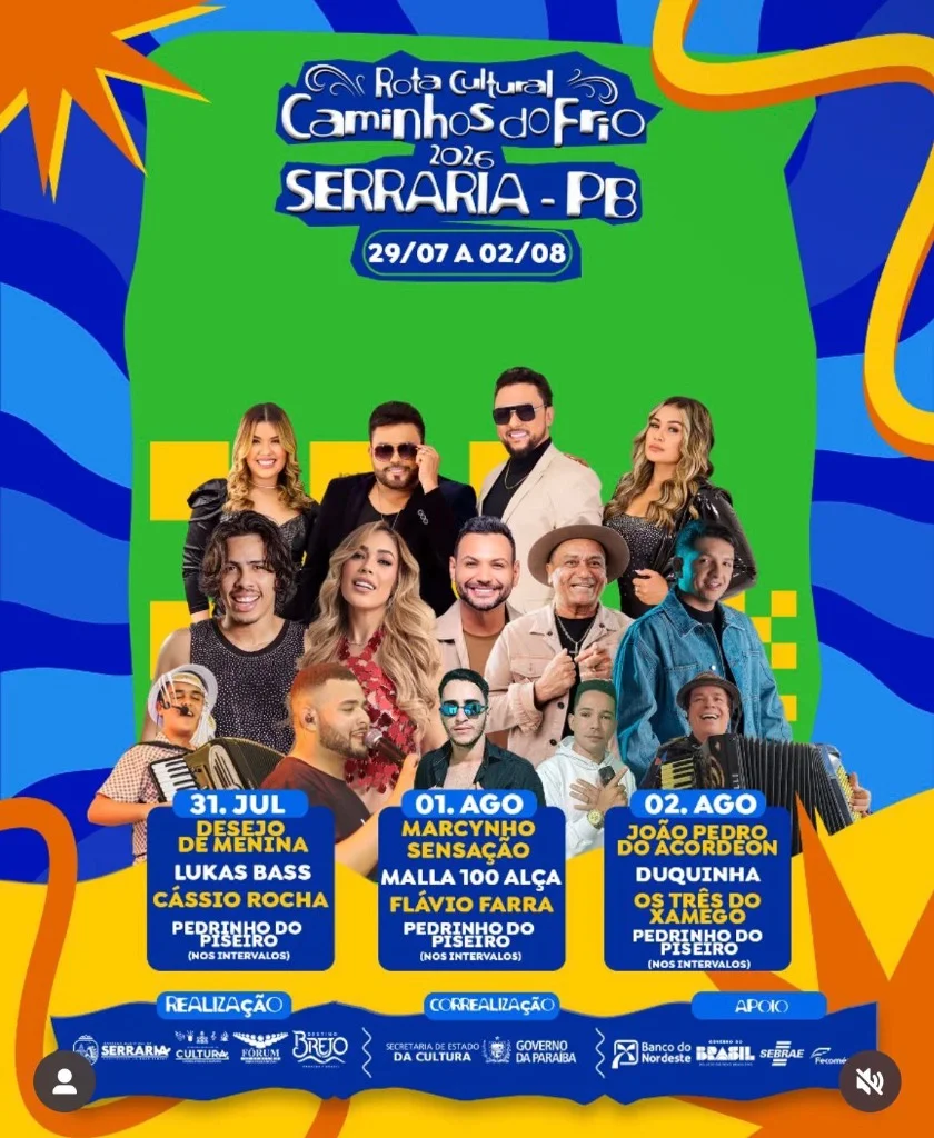 O clima frio da serra paraibana se encontra com o calor do forró! A Rota Cultural Caminhos do Frio 2026 chega com força total à cidade de Serraria - PB. Entre os dias 29 de Julho a 02 de Agosto, o município serrano receberá turistas de todo o Brasil e uma super grade de shows musicais preparada pela prefeitura local em parceria com o Governo do Estado e o trade turístico Caminhos do Frio.